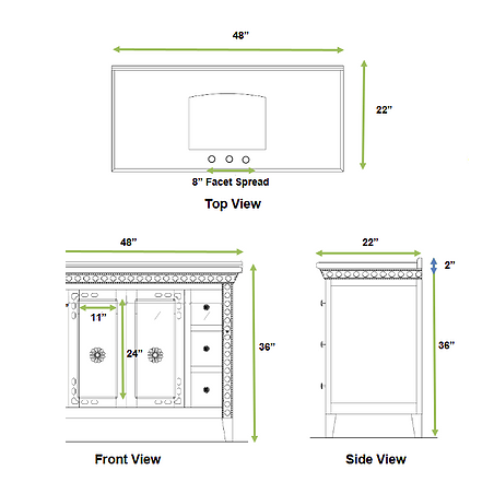 Distressed white and grey finish. It has a two-centimeter white quartz top with grey veining; a rectangular white porcelain undermount bowl; and a one-inch backsplash. The faucet spread is eight inches. 48x22x36