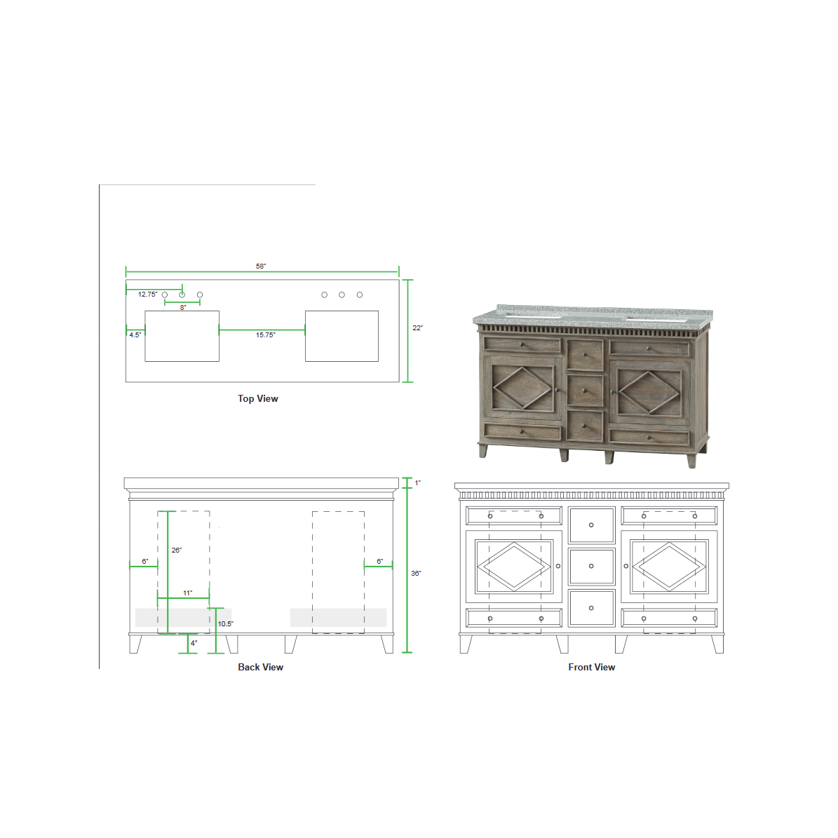 LK3858WT Rustic Wood 58" Vanity w/ White Quartz Top